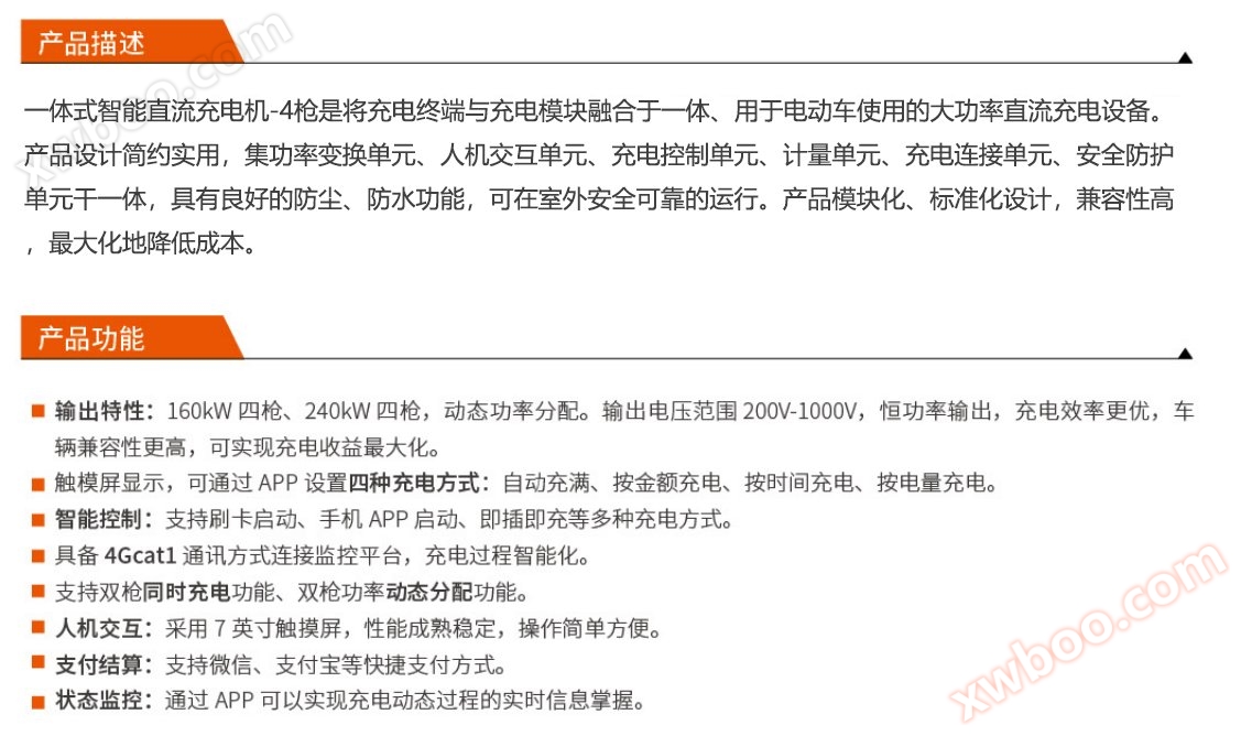 1, potenza di ricarica 160kW quattro pistoli, 240kW quattro pistoli, distribuzione di potenza dinamica, pistola singola può raggiungere 160kW. Tensione di uscita fino a DC750V / 1000V, potenza costante, alta applicabilità, alta compatibilità.
